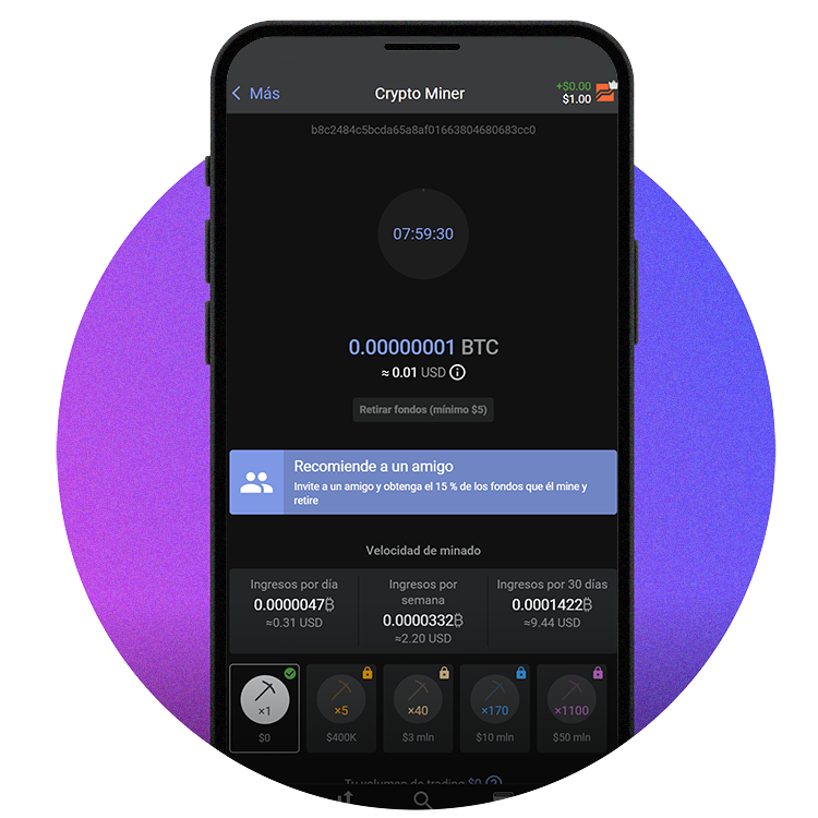 Vamos a utilizar el Crypto Miner de Libertex. Con su ayuda todo el mundo podrá minar y recibir una recompensa de al menos USD 20. Estos fondos no pueden ser retirados, pero pueden ser utilizados para realizar transacciones reales. Y los beneficios recibidos pueden ser retirados a tu wallet o tarjeta.
